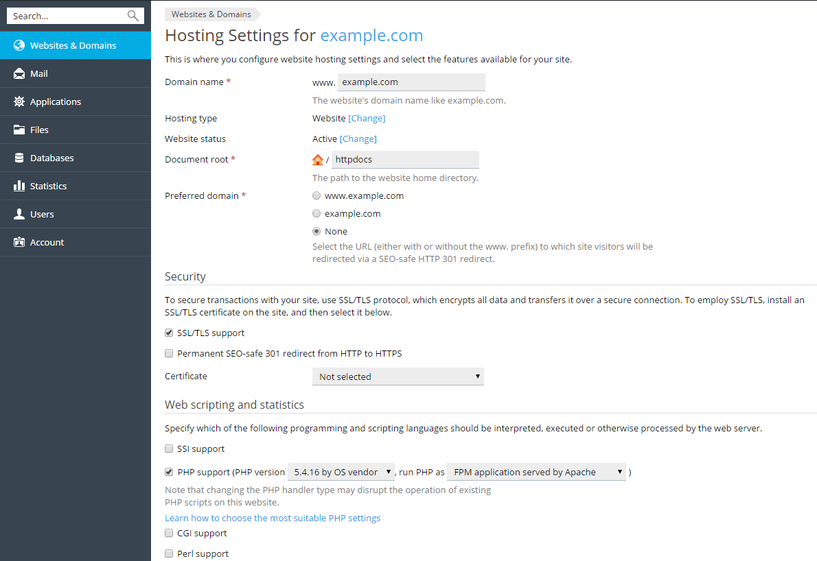 De algemene hostinginstellingen van een website zijn in groepen onderverdeeld: